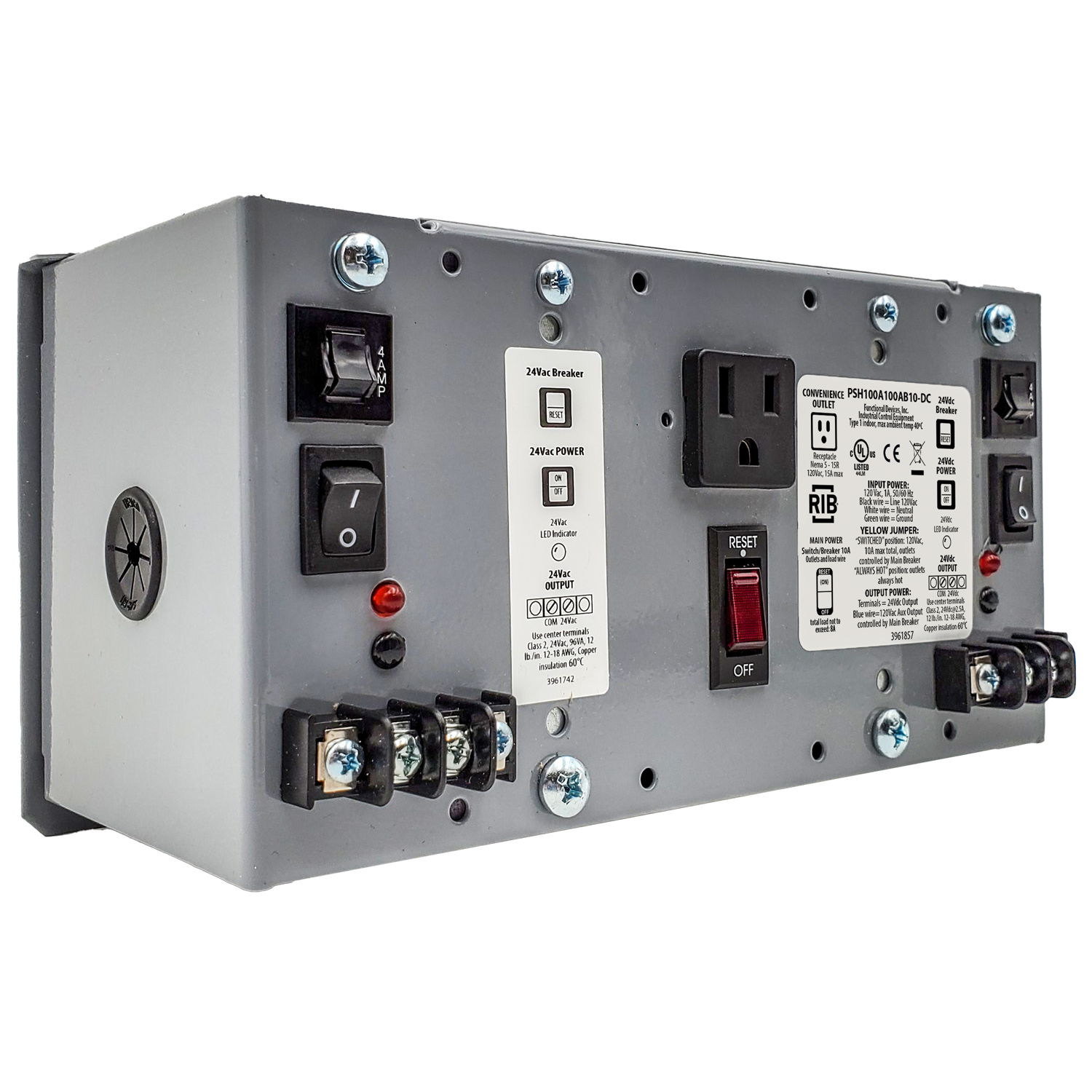 Enclosed Dual 60W 120 to 24Vdc + 100VA 120 to 24Vac UL Class 2 power supply w/10A Breaker