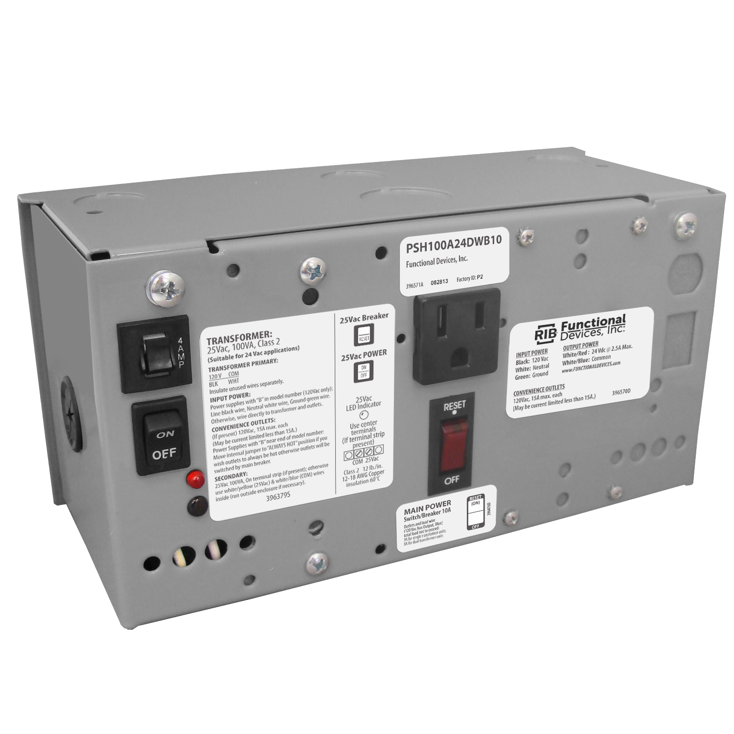 Enclosed 100VA 120-24Vac UL Class 2 & 2.5A/24Vdc PS w/10A main breaker w/wires