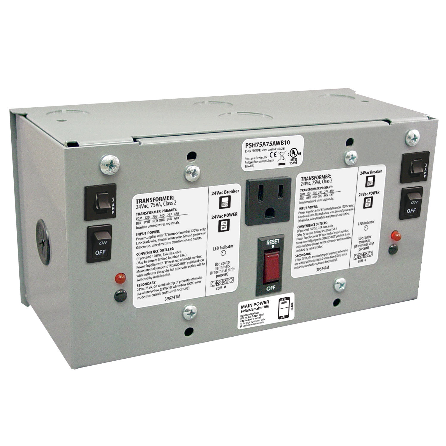 Enc Dual 75VA 120Vac to 24Vac UL Class 2 pwr supp sec wires 10A main breaker