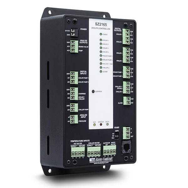 The SZ2165 is a microprocessor-based boiler controller for use in multi-stage boiler applications. It includes chiller support and control functions.